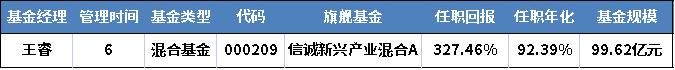 代表基金:信诚新兴产业混合A(000209),任职总回报316%,年化收益92%。