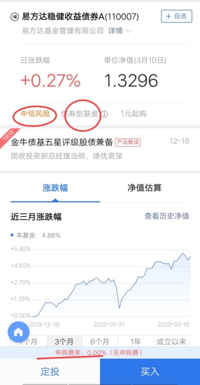 在这个界面中我们需要注意划线的几个部分,一个是风险程度,一个是债券类型,底下一个是申购费(买基金时需要缴纳的手续费)