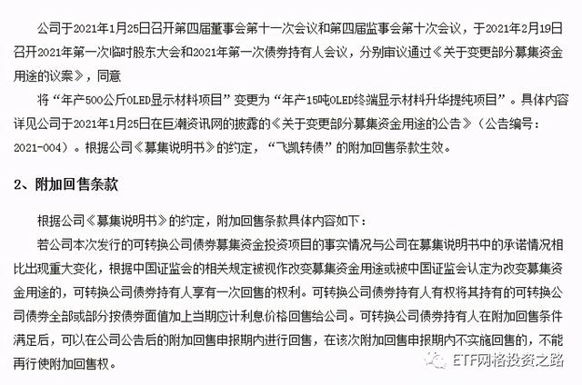 根据《上海飞凯光电材料股份有限公司创业板向不特定对象发行可转换公司债券募集说明书》(以下简称“《募集说明书》”)的约定,“飞凯转债”的附加回售条款生效,转债持有可以按照规定时间参与回售,如果在规定时间不参与回售,将视为放弃回售的权利。