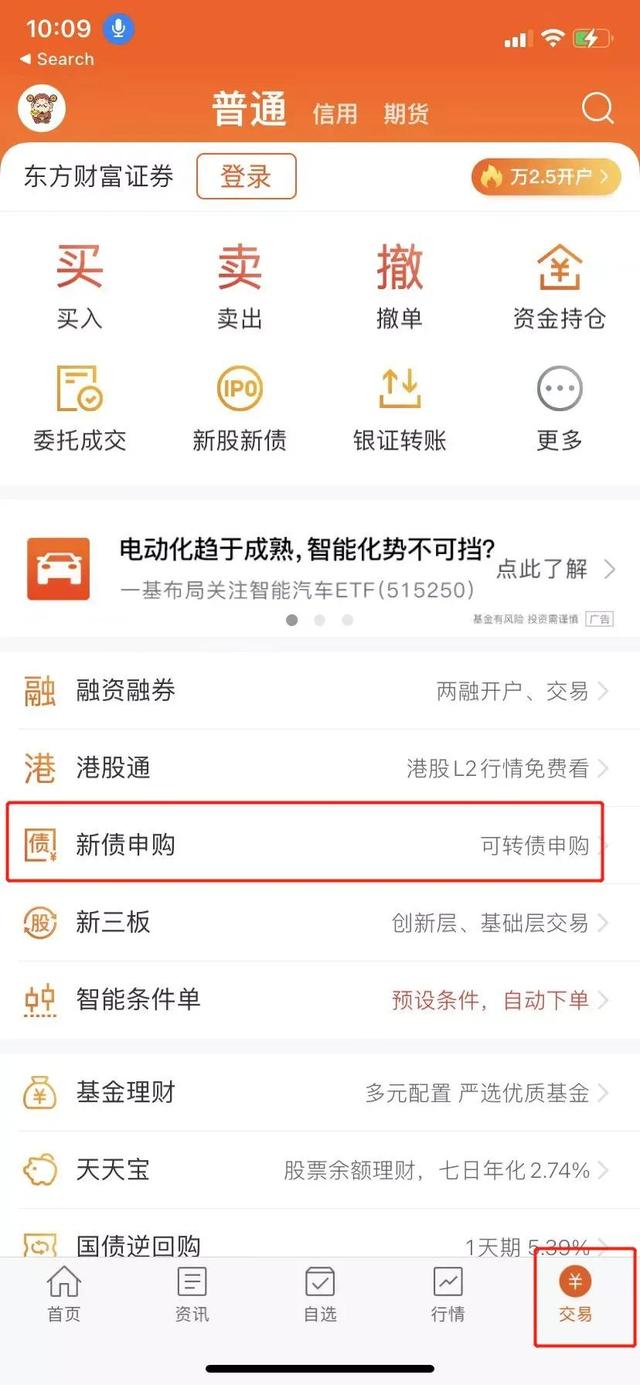 以“东方财富”app为例,在底下“交易”栏进入“新债申购”操作。
