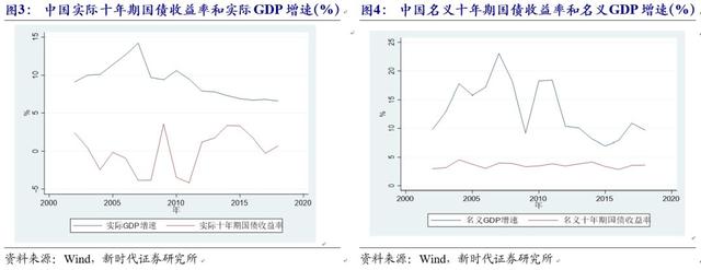 很多人认为,长期来看,一国的国债收益率应和经济增速差不多,这背后的理论基础是利率黄金规则。根据索罗模型,稳态下,当消费最大化时,资本边际回报率=人口增长率n 技术进步率g 折旧率δ,长期来看,利率r由资本边际回报率减去折旧率决定,而经济增速则由人口增长率和技术进步率决定,因此,便有r=n g。确实有很多国家的长期名义(实际)国债收益率与该国的名义(实际)GDP增速的走势较为一致。以美国为例,如图1、图2所示,美国名义(实际)十年期国债收益率总体来看围绕其名义(实际)GDP增速波动。反观中国,从图3、图4可以看出,中国实际和名义十年期国债收益率分别远远低于中国实际和名义GDP增速。这和美国明显不一致。那么为什么中国国债收益率低于中国经济增速呢?