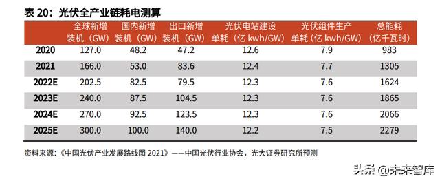 根据我们的测算,到 2025 年,270W 的光伏电站总耗能预计约为 330.3kwh, 每 GW 的建设能耗约为 12.24 亿千瓦时;不算逆变器、支架、运输、土建能耗, 单纯光伏组件每 GW 的生产能耗大约为 7.54 亿千瓦时。 根据 CPIA(中国光伏协会)的预测,在乐观和悲观情形下,2022-2025 年 全球新增光伏装机分别为 225/270/300/330GW 和 180/210/240/270GW;中国 乐观和悲观情形下新增光伏装机分别为 90/95/100/110GW 和 75/80/85/90GW。 实际上,我国光伏组件大部分用于出口,我国光伏组件产量约占全球总产量 的 80%,我们假设到 2025 年全球 80%左右的光伏组件仍由中国生产,对于出 口的光伏组件我们使用生产能耗测算(不算逆变器、支架、运输、土建),对于 国内新增的光伏装机,我们使用建设总能耗测算,最终我们测算出来到 2025 年, 国内光伏全产业链的耗电总量将达到 2278.6 亿千瓦时,在全社会用电量中的占 比将由 2021 年的 1.6%提高到 2025 年的 2.4%。
