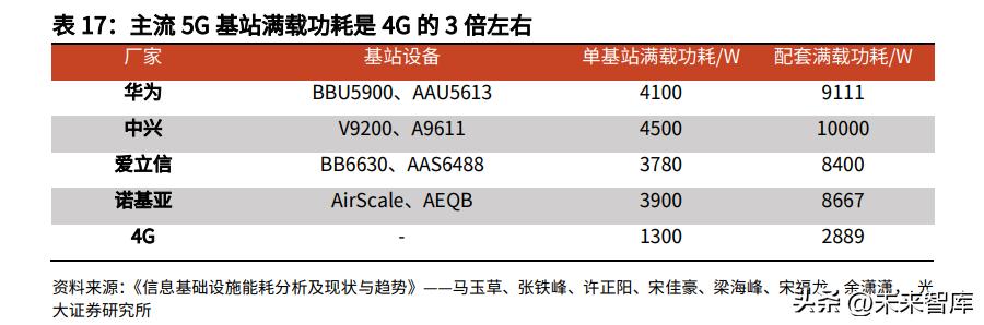 单设备能耗提升驱动通讯基站耗能的增加。根据 2018 年《基站节能减排措 施探讨》的统计,基站整体的功耗由主设备(45%)和空调系统(40%)为主, 剩余部分主要是电源系统和其它设备的功耗。目前常见的 5G 宏基站单基站(主 设备)功耗约为 3-4kw,整体配套功耗可以达到 10kw 甚至更高。一般 4G 单基 站功耗为 1.3kw,目前主流的 5G 单基站功耗大约为 4G 的 3 倍。按照单基站占 整体配套功耗的 45%计算,目前主流 5G 基站的配套满载功耗在 8.4-10kw,而 4G 基站仅为 2.9kw 左右。