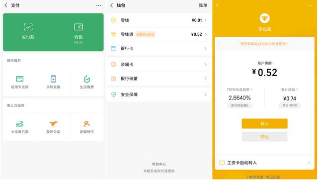还有零钱通,微信新推出的一个功能(类似支付宝的余额宝),存入零钱通的钱可以直接消费,也能够赚取收益;理财通,支持购买货币基金、债券基金、保险、以及劵商产品等。