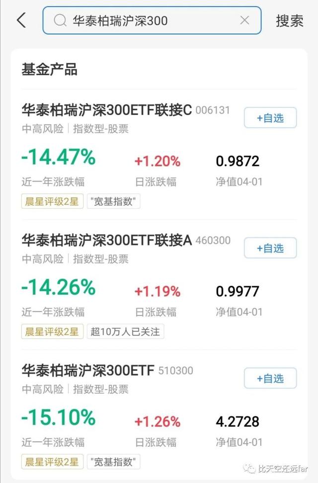 所以,ETF联接基金没有二重收费。你可以放心持有或交易广发纳指100ETF联接基金。上一节介绍的ETF基金都有对应的联接基金,可以在支付宝、天天基金、蛋卷基金等第三方平台,或相应的基金公司平台搜索基金名字,就可以找到对应的联接基金。通常,你会找到两个联接基金,以沪深300ETF为例,我在某平台搜索“华泰柏瑞沪深300”,出现了3结果,华泰柏瑞沪深300ETF联接A,华泰柏瑞沪深300联接C、华泰柏瑞沪深300ETF。