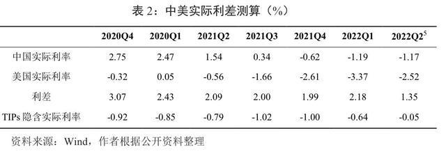在通货膨胀率整体上升、名义利率分化的背景下,中美实际利差呈收窄态势。特别是2022年二季度以来,中美实际利差收窄态势明显加快(表2)。本文测算的中美实际利差显示,2021年末至2022年5月10日,中美实际利差由1.99%降至1.35%,这与TIPs反映的美国实际利率走势具有高度一致性(-1%降至-0.05%)。
