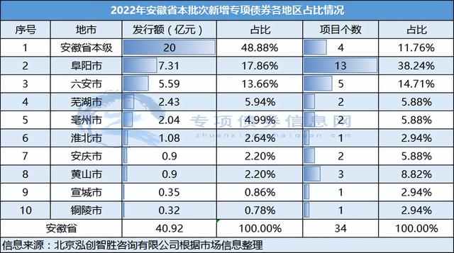 从拟发行金额来看,省本级拟发行金额最多,拟发行20.00亿元,占拟总发行额的48.88%;其次为阜阳市、六安市,拟发行金额排名全省第二、三名。
