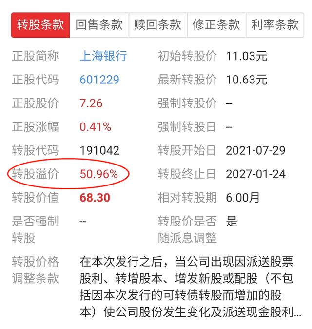 事实上我们是不需要手动算溢价率的,在任何一家券商可转债界面,可转债条款里我们可以直接看到溢价率,如下图