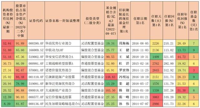 从机构占比的变化来看,王健机构占比最新一期是提高的,而大部分基金机构占比是下降的,周海栋机构占比从64.24%下降至52.84%,下降了11.40%。