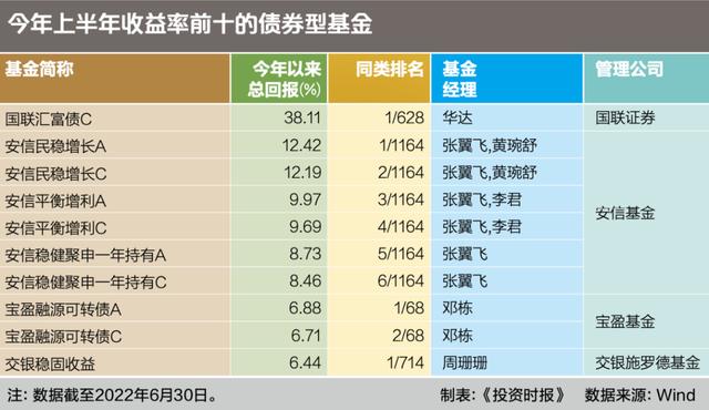 排名前十的债券型基金还包括安信稳健聚申一年持有A、C、宝盈融源可转债A、C、交银稳固收益,收益率均在6%以上。