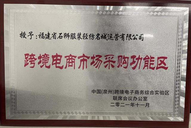 今日下午,记者从福建省石狮服装轻纺名城运营有限公司获得好消息,在日前举行的“2021泉州电商创新创业创造大赛暨首届跨境电商大赛”启动仪式上,举行了“中国(泉州)跨境电子商务综合试验区线下功能园区”授牌仪式,石狮国际商贸城喜获“中国泉州跨境电商综试区跨境电商市场采购功能区”牌匾。