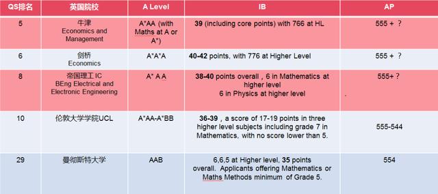 以下是部分英国名校的A-level、IB、AP的分数要求: