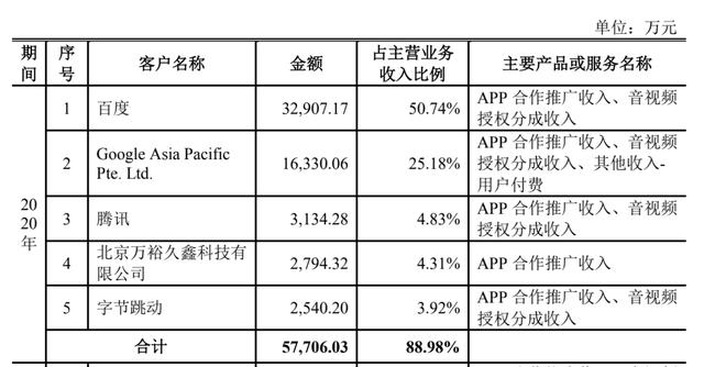 过去的3年间,宝宝巴士约一半的年收入都来自于百度。2020年,前五大广告客户(百度、谷歌、腾讯、北京万裕久鑫科技有限公司、字节跳动)的总营收占比高达88.98%。