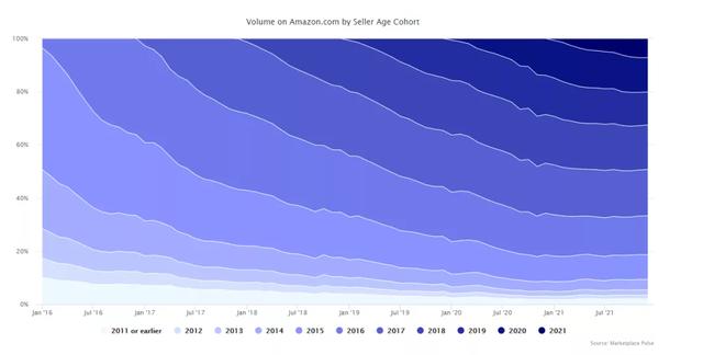 根据亚马逊卖家同期群数据(cohort data,留存分析会参考的数据之一)显示,亚马逊的卖家流失率很稳定,新卖家也在平台找到了机会。下图是按亚马逊卖家逐月的总交易量,及卖家在平台(产生销售额)的第一年细分,并以其在总交易量的占比份额进行分区的数据图。若图表中最右上层(代表最新的卖家)看起来有明显的不同,则代表平台存在一定问题。这张图较为直观地展示了平台(卖家)的可持续性和竞争的平衡性。例如,若图最右上层的区域比往年同一时间段内大幅减少,就表示市场已然饱和,若较往年同一时间段增大,则代表已有卖家的流失速度变快: