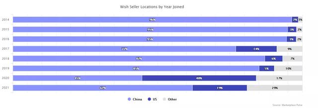 现阶段,Wish已有60多万个卖家入驻,且其加快了吸引除美国和中国以外的其他国家/地区卖家入驻的脚步。2021年,Wish近30%的新卖家来自如墨西哥、英国、巴西、加拿大、摩洛哥、意大利、斯里兰卡、法国、越南和澳大利亚等国家。但在Wish,96%的最活跃卖家(至少有100个评价)仍是中国卖家。