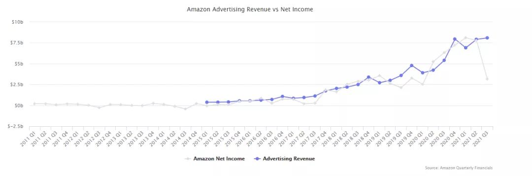 亚马逊在广告方面收入的可观性引来了其他平台的效仿:eBay开始用广告位取代了产品推荐。沃尔玛首席客户官Janey Whiteside在接受CNBC采访时也曾坦言,沃尔玛将大力发展广告业务,争取在在未来几年内成为美国十大广告平台之一。从下表可以清楚看到,将亚马逊的净收入(利润)与广告收入相比较,其广告业务产生的利润增长几乎与亚马逊的利润率增长曲线一致: