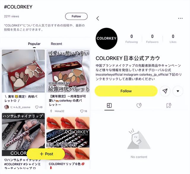实际上,已经有国货美妆品牌在Lemon8上注册了官方账号。例如,珂拉琪COLORKEY在官方账号未发布推广内容和0点赞的情况下,COLORKEY的话题关注已突破2K。
