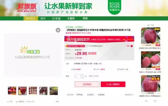 2014年,礼县远亮果蔬有限责任公司抢抓全县发展电商的良好机遇,积极转型电商发展模式,在阿里巴巴国际站注册速卖通,开通天猫“鲜飘飘旗舰店”等店铺,实现了集传统外贸、跨境电商、国内电商为一体的互补经营,为礼县苹果打开国内外市场起到了重要作用,开启了礼县跨境电商的先河。今年双11购物狂欢节4款宝贝入驻主会场,9款宝贝参加双11购物津贴(满400减50)活动。