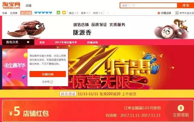 淘宝网店--陇源香,上线于2015年12月,目前信誉为五钻。店铺主要经营成县当地农产品,其中开口熟松子和野生松子远销全国,很受欢迎。店铺参加双11淘宝嘉年华活动,双11当天不仅仅价格全年最低,更有5元无门槛店铺红包、满200减20的优惠活动。野生松子、开口熟松子、核桃、核桃仁等产品一件包邮,两件减二元,凡下单者也有好礼相送,真正的大降价、巨划算,同时承接一件代发外地,成县同城送货上门。