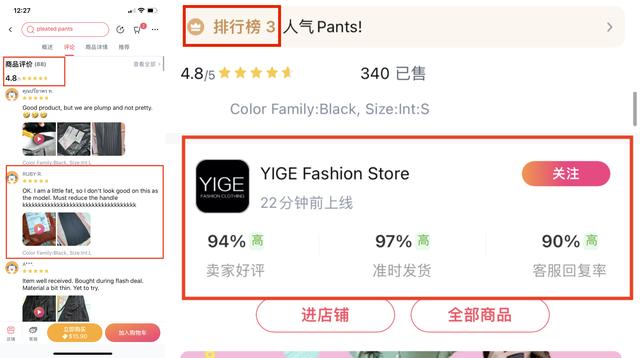 并且,在详情页内可以看到產品的排名(排行榜3)来让用户产生从众心理跟随潮流,并通过产品相关的评分和用户评价以及商家的总体评分等来让用户对产品产生信任感: