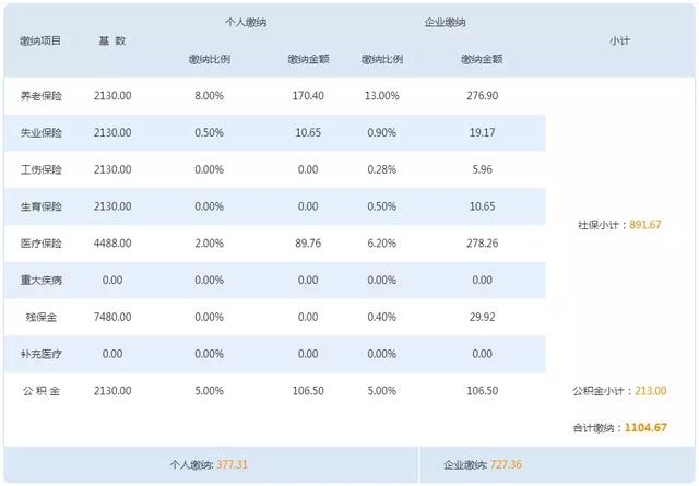 【个人月缴纳五险一金】=170.40 10.65 89.76 106.50=377.31(元)