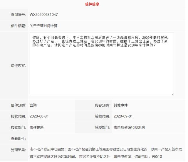 答:市不动产登记中心回复:因不动产权证的换证等原因导致登记日期发生变化的,以同一产权人首次取得不动产权证之日为起算时间。市民若还有不明之处,请来电咨询,咨询电话:96510
