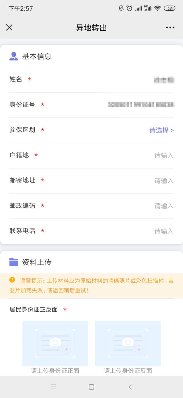 8、然后继续填你的资料,注意选择文件,文件是什么呢?其实就是之前寄给我们的参保转移凭证,我们拍个照上传上去就好了。