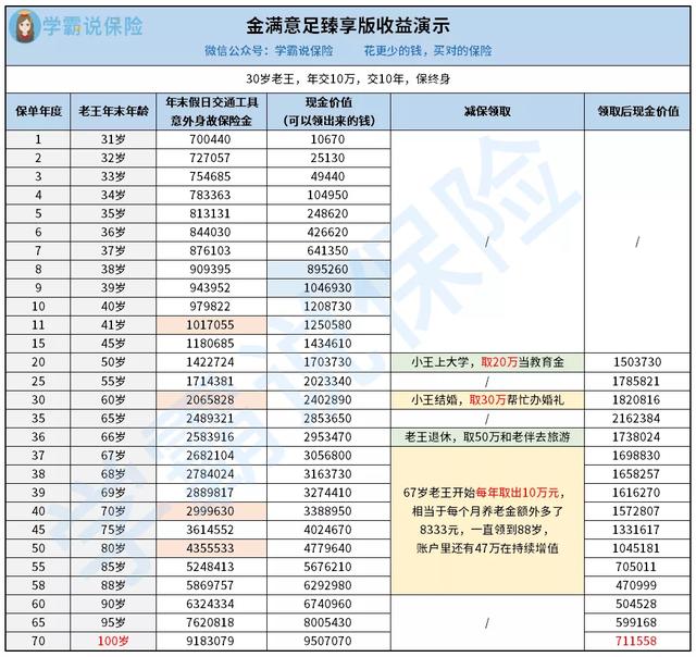 下面我们以30岁老王为例,他入手了一份金满意足臻享版,年交10万,共交10年,保终身,具体收益如下图所示: