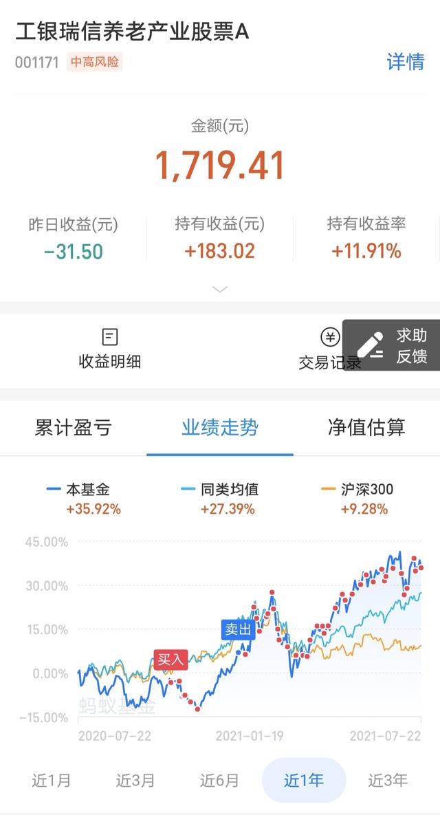 养老产业基金,2020/10/29第一次买入,后来赚了点钱卖出了,2021/01/07开始定投,定投6个月,每周40元,偶尔手动补仓