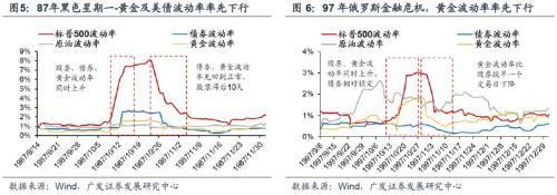 高波动时期经验表明,波动率下行期黄金波动率多数情况下具有指示作用,黄金波动率或者领先于股票波动率下行,或者二者同时下行但黄金波动率率先回到正常水平以确认股票波动率下行趋势。分别查看历次波动率下行时期,大类资产下行的时间顺序。1987年黑色星期一,股票、债券、黄金波动率几乎同时回落、债券、黄金波动率率先回到正常水平(87年10月27日),股票滞后10天回到正常水平(87年11月6日);1997年亚洲金融危机,黄金波动率比股票波动率提早一个交易日下降(黄金97年10月31日下降,股票97年11月3日下降);1998年俄罗斯危机,股票波动率率先下降,但是黄金波动率率先下降至正常水平,确认股票波动率下降趋势;2000年科网泡沫破裂,下行顺序并未见明显趋势;2001年911,黄金的波动率快速下降至正常水平,随后股票波动率跟随下行;2008年金融危机,黄金波动率率先下降,随后股票波动率下行至正常水平;2011年欧美债务危机,黄金波动率下行同样领先于股票。