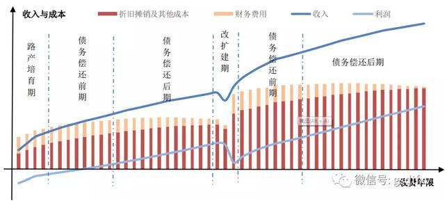 高速公路的收费周期大致可分为四个时段:一、公路刚建成的2-3年,车流量不稳定,且还本付息压力大,基本处于亏损或微利状态;二、车流量稳步上升,但负债仍很高,收入扣除现金类成本外大比例用于偿还利息,并偿还少量债务,盈利开始增长,但利润仍比较低;三、道路进入成熟期、车流量稳定,债务规模缩小,偿还利息比例也下降,财务压力下降,盈利快速释放,是高速公路的盈利黄金时期;四、若路产需要改建扩建,则新增大量资本开支,重新进入新一轮债务周期的前期。(见图一)