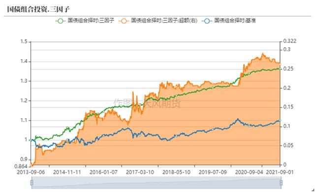 三因子。我们叠加通胀、增长与信用因子,以构造国债三因子模型,其样本内夏普比为1.14,年化超额收益为3.37%,同期国债组合基准夏普比为0.27。