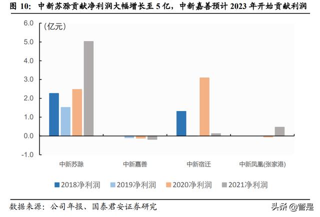 待出让一级土储 79%集中在滁州和嘉善,滁州土储进入成熟出让阶段, 嘉善土储 2023 年也将发力,保证土储稳定释放速度。公司在江苏的早 期项目包括苏州中新科技城、南通苏锡通(仅包括 1.48 平方公里协议分 成,另有储备成本 38.5 平方公里一级开发未计算在内)、宿迁苏宿工业 园的项目等,目前可出让规模已经较小,在手一级开发土储主要为滁州 中新苏滁高新区、中新嘉善现代产业园,分别占总土储的 60%、19%。1) 苏滁高新区 2012 年签约,2016 年开始逐步释放业绩,土地出让收入稳 步提高,目前占公司总体一级收入的约 50%;2)江苏省内由于每个园 区可出让土储量均偏低,每个园区土地收入具有一定不稳定性,但合计 仍可贡献约 50%收入,另外随着常熟、张家港项目进入土地出让阶段, 预计后续土储市场也将平稳增长;3)嘉善项目 2018 年签约,目前仍处 于前期阶段每年小幅亏损,参照滁州项目 5 年释放利润,预计嘉善项目 2023 年左右可开始出让地块确认收入。