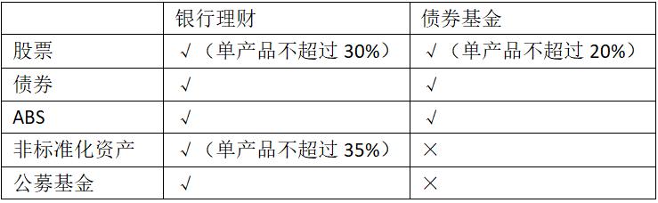 02 银行理财和债券基金是一样的吗?我们先看看债券基金和银行理财产品在监管层要求下的法定投资范围:
