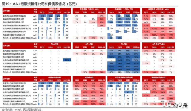 (3)中证融担、中证增:从在保债券规模看,截至 2022 年 8 月 29 日,中 证融担的在担保债券余额由 2020 年末的 34 亿元大幅增长至 268 亿元,这几年处 于业务扩张期,中证增的在担保债券余额则进一步下降至 192 亿元;从期限分布 看,两家公司剩余期限在 3 年以上的在保债券比重均明显下降,在保债券剩余期 限整体缩短;从主体评级看,中证融担业务主要集中于 AA 级主体,中证增则分布 相对均衡。进一步看融资担保城投债,中证融担业务主要集中于地市级城投,区县 级城投债占比不足 20%,中证增对区县级城投的担保规模占比相对较高。
