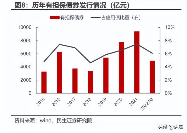 关于有担保债券:2022 年以来,新发债券中有担保债券占比相较 2021 年有所下降。截至 2022 年 8 月 29 日,2022 年新发行信用债中,有担保债券规模达 4922 亿元,占比 6.09%,低于 2021 年全年的 7.49%。 关于融资担保债券:2022 年以来发行规模 1456 亿元,占有担保债券比重 29.54%,略高于 2021 年全年的 27.07%。