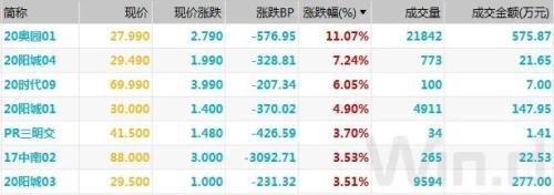 此外,涨跌幅居前的债券有,“17文投MTN001”涨超12%,“20豫能化MTN003”涨超9%,“16六盘水住投债”涨超8%;“19汉当科PPN001”跌超15%,“16汉当科MTN003”跌超8%,“20遵桥02”跌超5%。