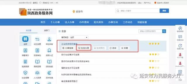 1.登录“延安政务服务网”(http://zwfw.yanan.gov.cn/),按县区、部门或事项分类查找所需办理政务服务事项,了解该事项的“办事指南”,点击“在线办理”按要求提交电子版申请材料,进行办理。