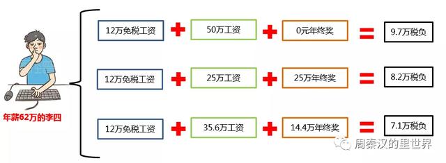 除了免税额12万,假设李四每个月工资拿一半,年底年终奖再拿25万,就可以大幅减税。