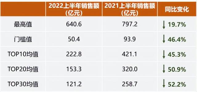 图:2022年上半年浙江省销售额TOP30各梯队均值与去年对比