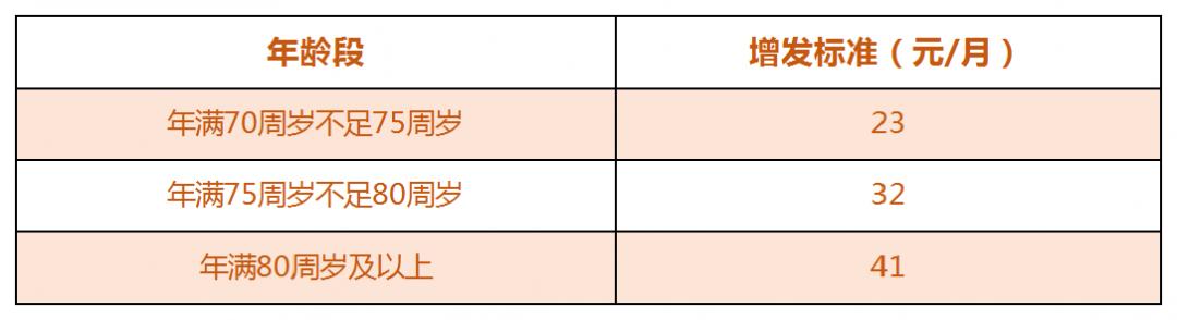 高龄倾斜:2020年12月31日年满70周岁(年龄以办理退休手续时确定的出生年月为准)、75周岁、80周岁的人员,在上述普发的基础上,每人每月分别增发23元、32元和41元。