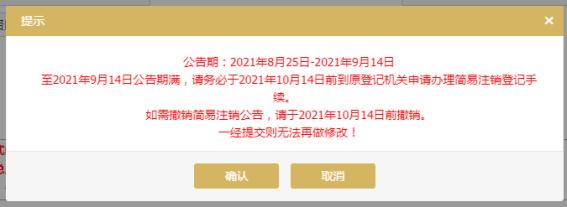 注意:企业只有一次机会申请简易注销公告!如选择撤销简易注销公告,将不能再次注销公告,申请办理简易注销登记手续。