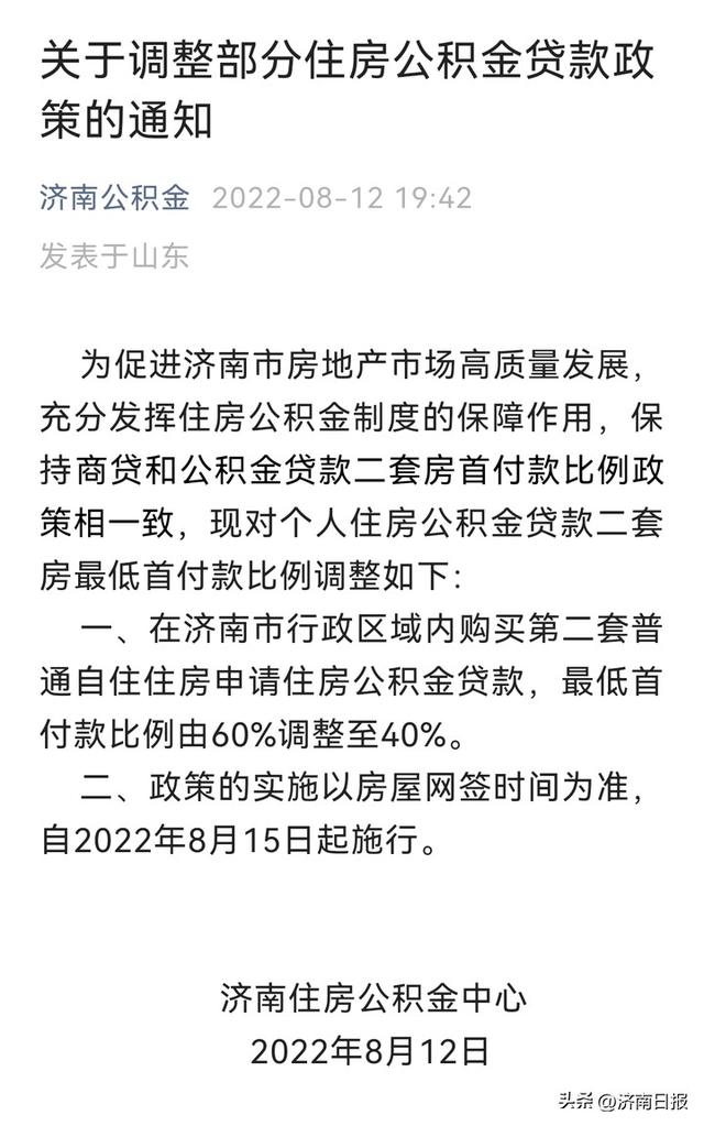 具体调整内容为:在济南市行政区域内购买第二套普通自住住房申请住房公积金贷款,最低首付款比例由60%调整至40%。政策的实施以房屋网签时间为准,自2022年8月15日起施行。