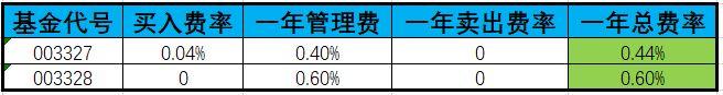 比如,基金003327和003328,003327有买入费率,而003328没有。可能大家刚开始会被没有费率的003328吸引,但是对比一年的总费率,003328比003327高出0.16%。综合收益率,003327不仅总费率更低,收益率也比003328更高。