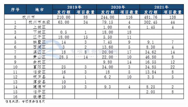 表3:杭州市2019-2021年各区县新增专项债券发行情况(亿元、个)