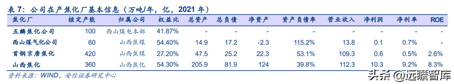 西山煤电主要焦化厂包括西山煤气化、五麟焦化公司、首钢京唐焦化,年核定产能分别为 60 万吨、100 万吨、420 万吨,五麟焦化公司为西山煤电控股子公司,持股比例为 80%,为公司三级控股子公司,持股比例为 41.87%;西山煤气化为山西焦煤全资子公司,为公司三级控股子公司,持股比例为 54.4%,2021 年末为资不抵债,总资产为 14.9 亿、总负债为 17.2 亿、净资产为-2.3 亿,2021 年营业收入为 13.8 亿,净利润为 926.1 万,净利率为 0.7%;京唐焦化为山西焦煤控股子公司,持股比例为 50%,为焦煤集团三级子公司,持股比例为 27.2%,2021 年总资产为 47.5 亿、总负债为 25.2 亿、净资产为 22.3 亿,资产负债率为 53.1%,2021 年营业收入为 109.3 亿,净利润为 0.6 亿。