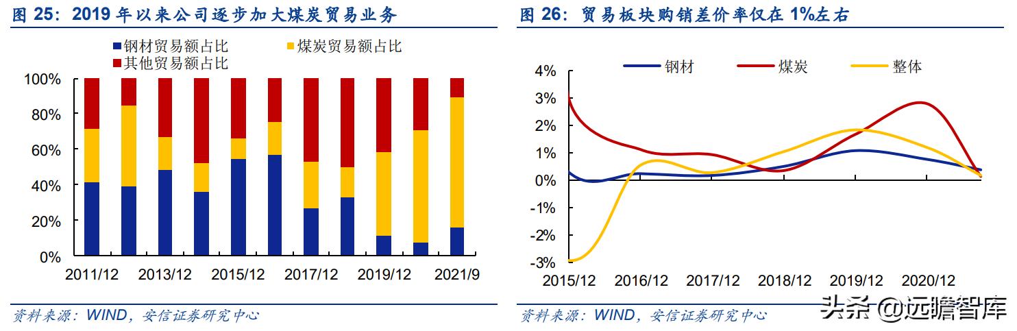 2019 年以来公司逐步加大煤炭贸易,购销差价率在 1%左右。2015 年以前公司贸易板块以 钢材贸易为主,销售额占比基本在50%以上,但钢材购销差价率持续下降,2015年仅为0.3%,明显较低。