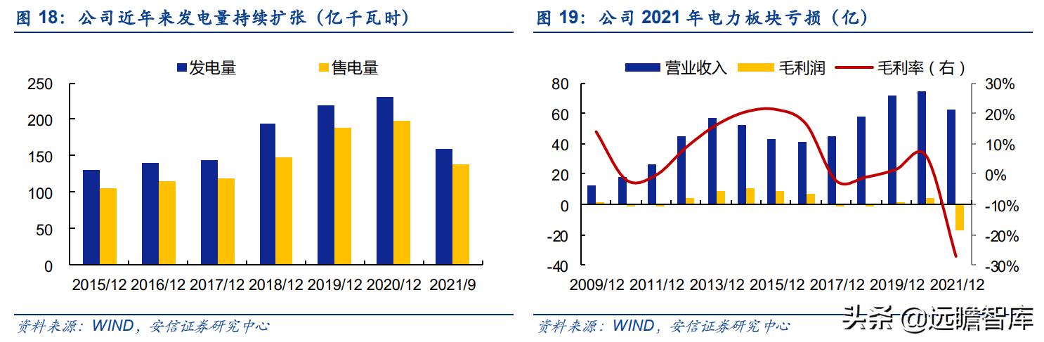 2016 年起,煤炭原材料成本大幅提升,盈利能力迅速恶化,2017-2018 年电力毛利率跌至负区间。2019-2020 年间,电力项目投产以及煤炭价格下跌,电力营业收入持续增长,毛利率持续改善。2021 年煤炭价格大幅上涨,电力板块亏损,毛利率跌至-27.1%。