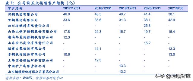 公司销售客户集中度较高,2017 年以来前五大销售客户占比基本保持在 40%以上,主要集中于首钢、太钢不锈钢等钢铁企业。