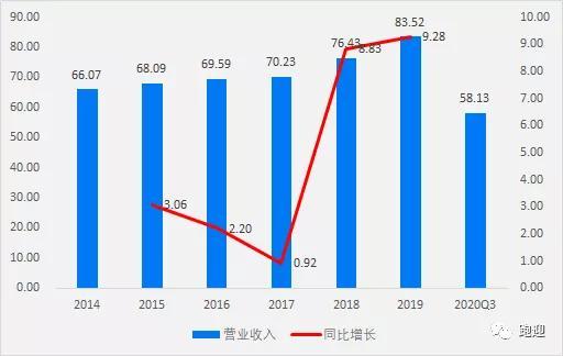 2014-2019年,营业收入由66.07亿元增长至83.52亿元,复合增长率4.80%,19年同比增长9.57%,2020Q3实现营收同比增长12.38%至58.13亿元;归母净利润分别为6.01亿元、4.77亿元、4.60亿元、5.42亿元、4.79亿元、5.56亿元,19年同比增长16.00%,2020Q3实现归母净利润同比增长55.75%至4.15亿元;扣非归母净利润分别为4.61亿元、2.64亿元、3.25亿元、3.73亿元、1.74亿元、2.29亿元,19年同比增长31.87%,2020Q3实现扣非归母净利润同比增长67.09%至3.67亿元;经营活动现金流分别为0.91亿元、5.20亿元、-1.05亿元、-1.01亿元、0.35亿元、7.36亿元,2020Q3实现经营活动现金流-5.44亿元。